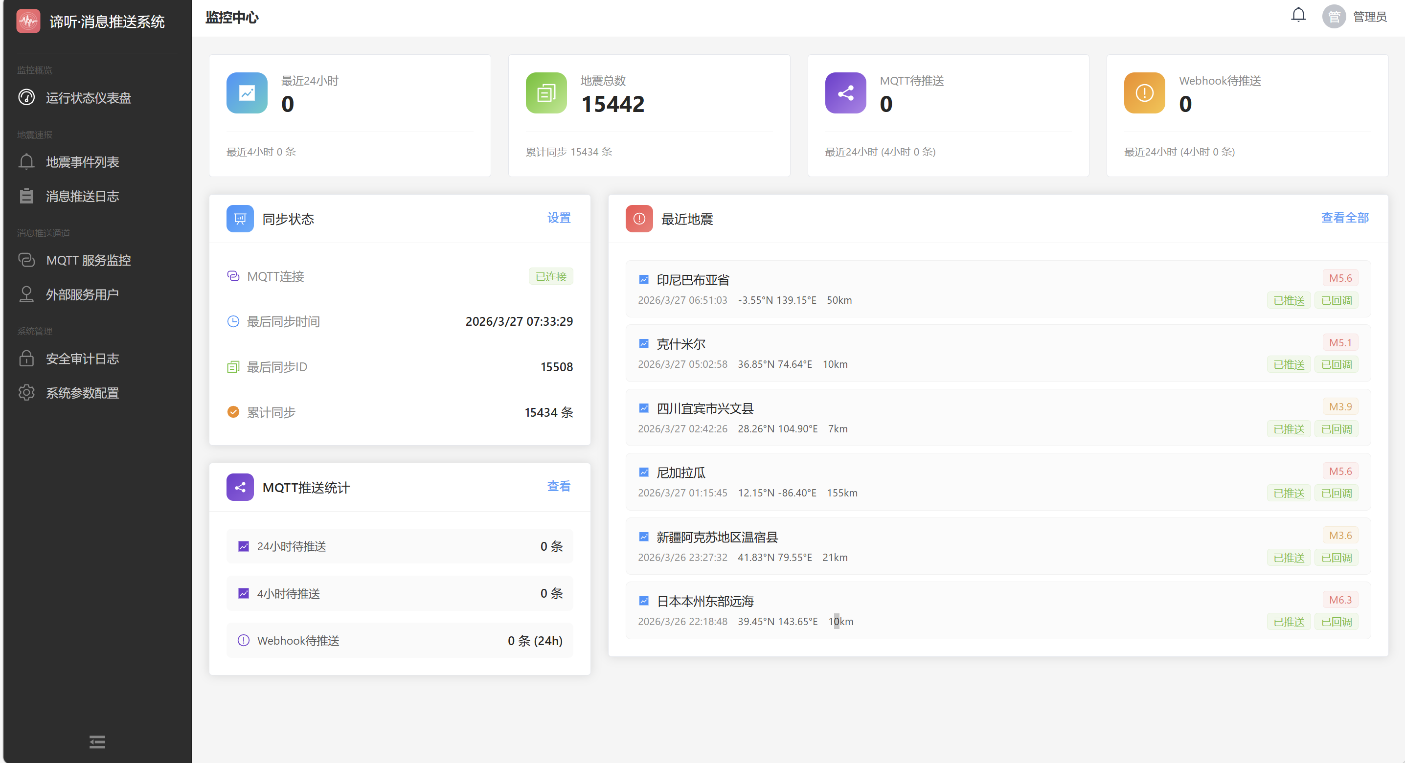EventsPush 是专为地震监测与预警场景打造的信息集中发布与推送平台。它致力于解决地震信息在多系统、多终端间分发不及时、不统一的痛点,通过标准化的消息协议与灵活的推送机制,将地震速报、台站状态、系统告警等关键信息,毫秒级触达下游应用与用户终端。