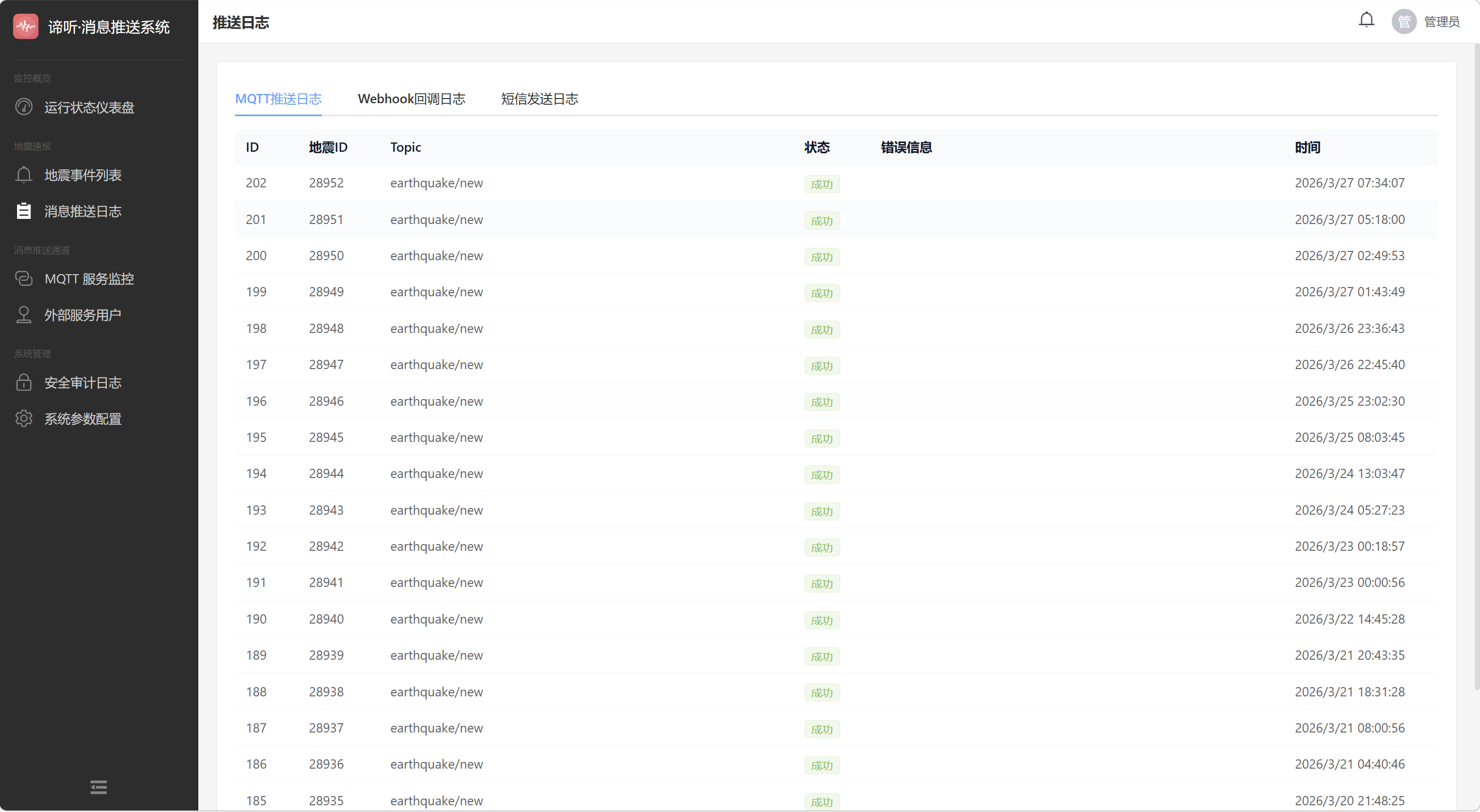 | 统一发布入口 | 提供集中式的消息发布管理界面,支持地震事件、系统状态、告警信息等多种类型消息的统一编排与发布 |