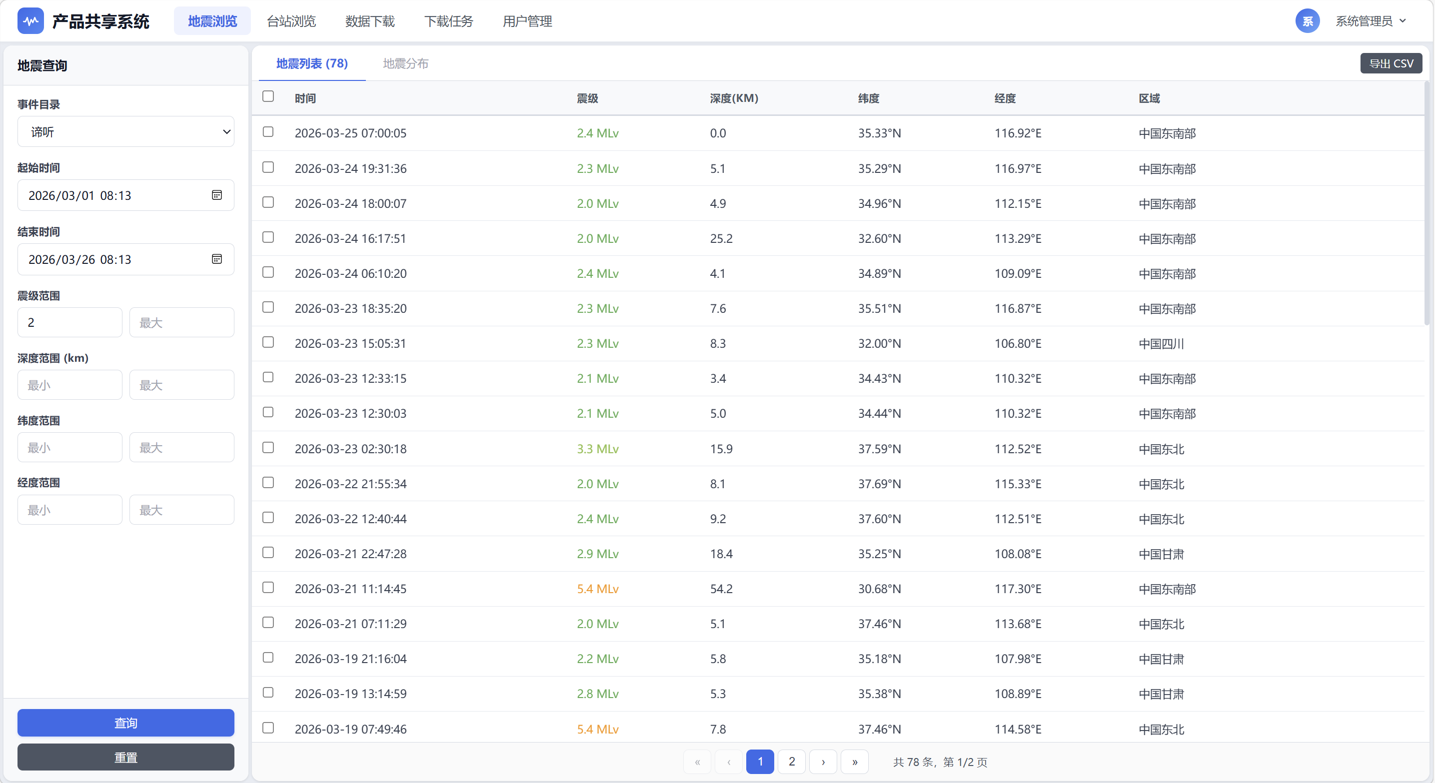 - 地震目录空间分布:具备完善的地震目录管理与可视化功能,可在地图上在线查看地震目录的空间分布