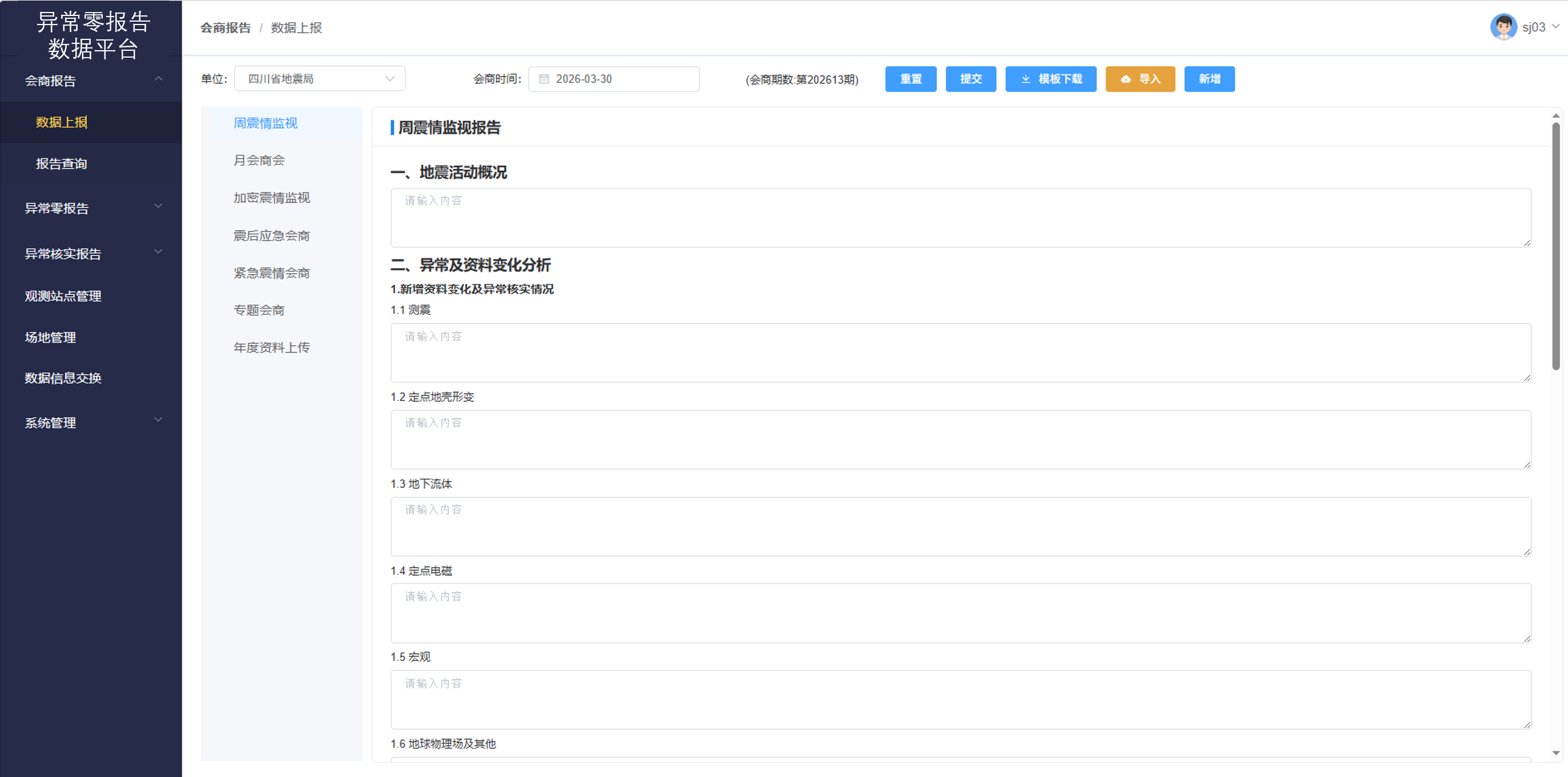 - 多维度填报模板:支持"周震情监视报告"等定制化表单