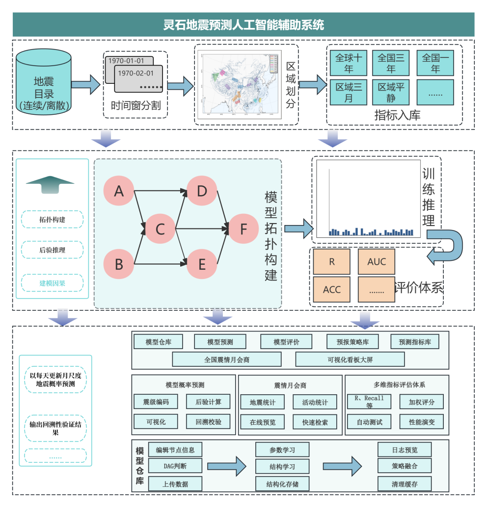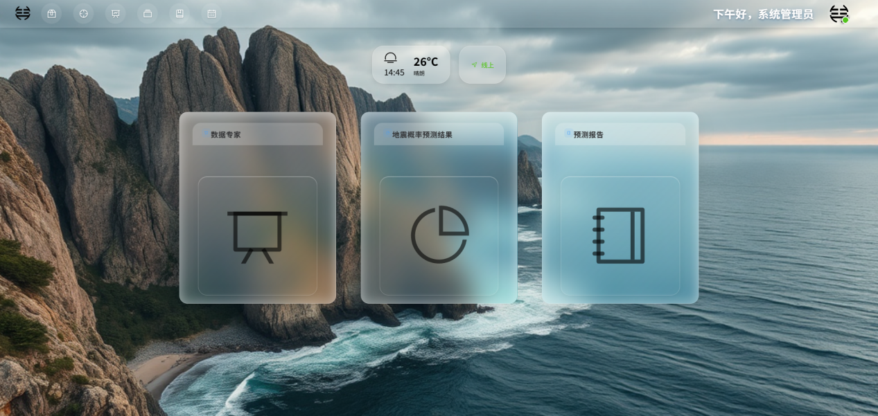 系统面向地震概率预测业务,围绕**“数据—模型—研判—服务”**全流程,提供历史数据可视化、风险研判、概率预测、模型管理与评估及报告生成等能力。支持多模型融合预测与量化评估,输出风险等级与图表结果,实现从预测到验证的闭环管理。